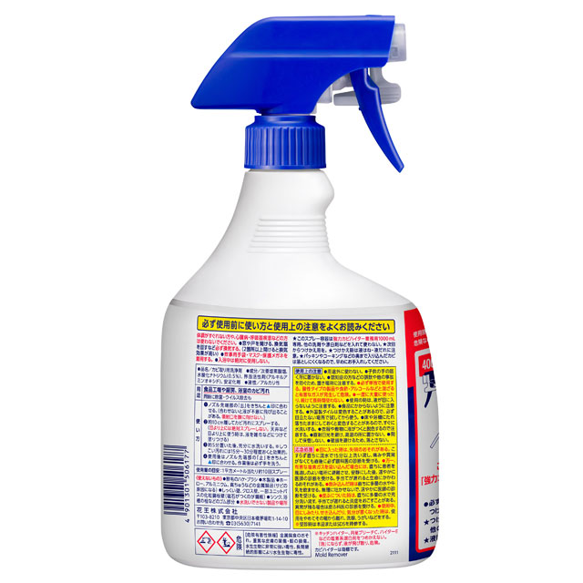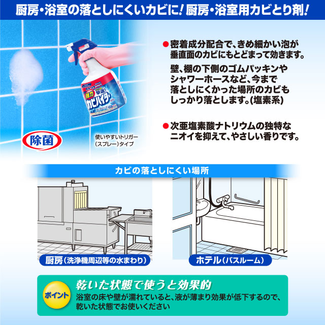 厨房の壁面、浴室の壁、ゴムパッキン、シャワーホースなどの落としにくかった垂直面のカビも、泡が密着しとどまって効くことでしっかり退治します。