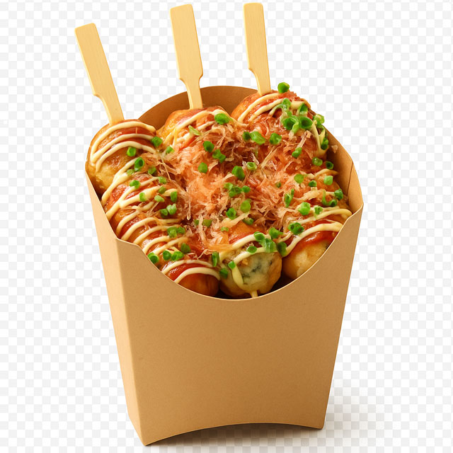 フライドポテトや唐揚げ、ポップ―コーン、ドーナツ、たこ焼き、串焼き、ホットドッグなど、耐油性があるため、様々な用途でお使い頂けます。