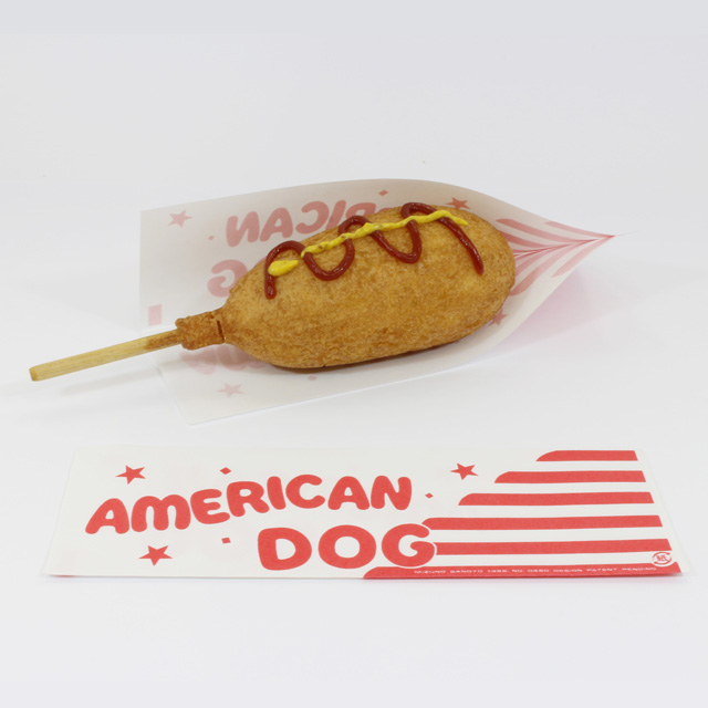 出店などでアメリカンドッグを販売するときに使う紙袋です。4辺のうち2辺が開いていますので、アメリカンドッグを入れやすくなっています。