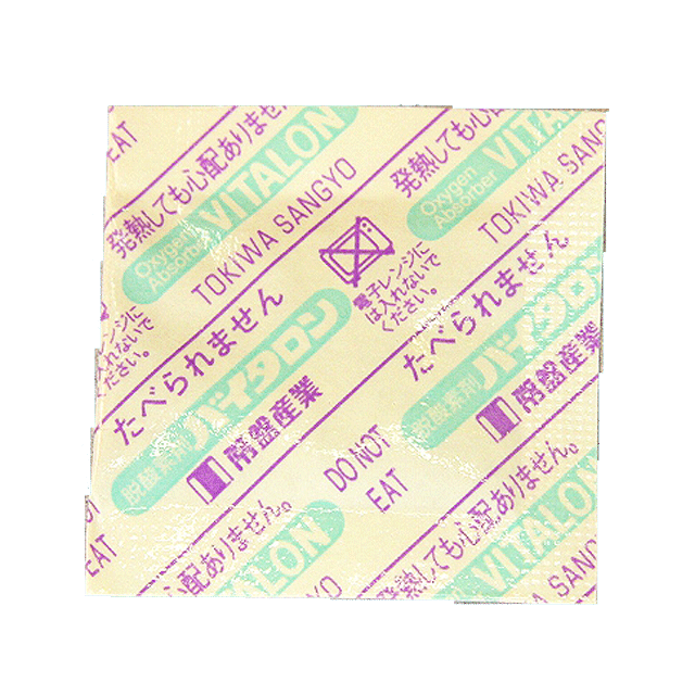 半生菓子・まんじゅう・最中・甘納豆・生パン粉・削り節・バウムクーヘン・チーズ等に適した自力反応型脱酸素剤です。作業時間は、2時間以内、脱酸素までの時間は気温20℃で、半日~1日かかります。