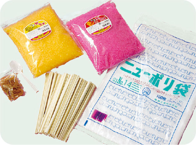 ●内容/色いろザラメ2袋・割り箸100本分・無地袋100枚・輪ゴム100本・スプーン1本
