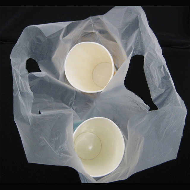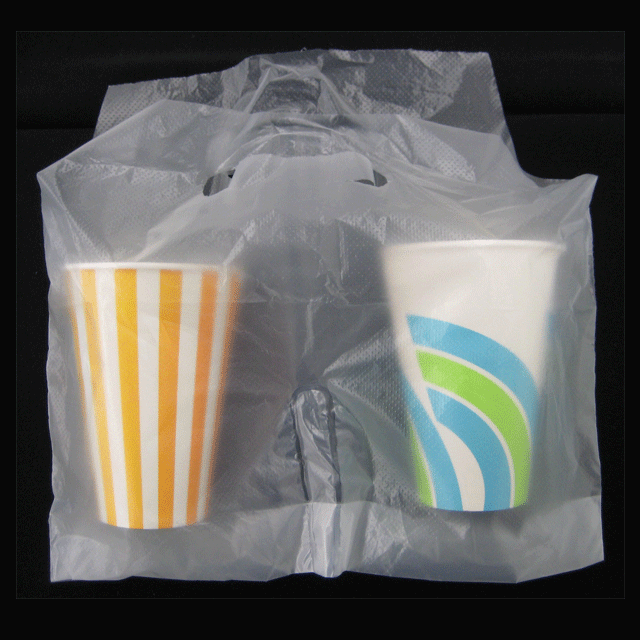 ドリンクカップがすっぽり2本入る仕切り付きビニール袋です。HOTドリンクは、持つときに手が熱くなり、蓋付近を持っていたら、蓋が外れてしまったり、